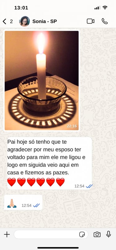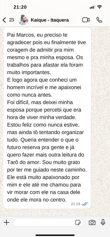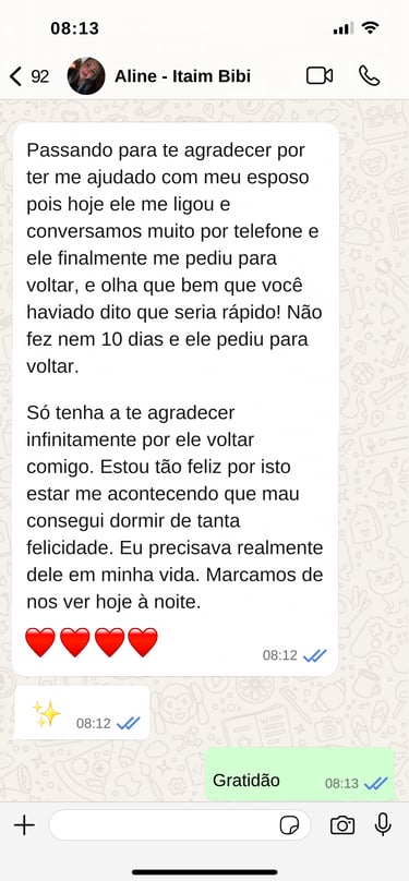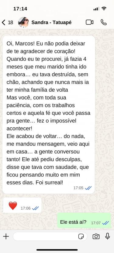É com imensa gratidão que escrevo estas palavras para expressar meu profundo agradecimento a vocês. A leitura das cartas e os trabalhos de amarração amorosa foram fundamentais para trazer de volta o amor da minha vida, minha esposa querida.