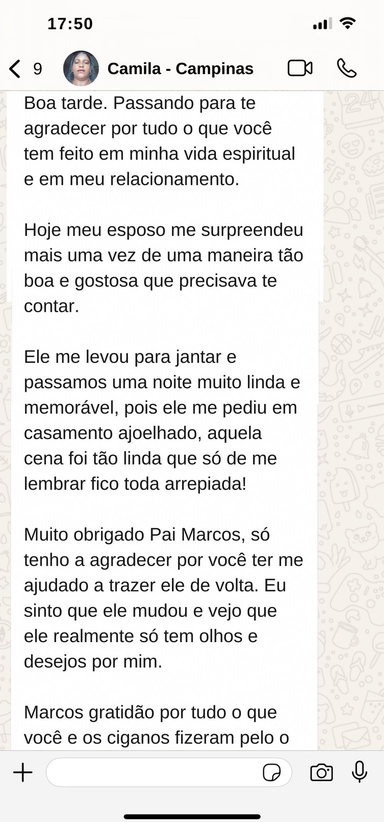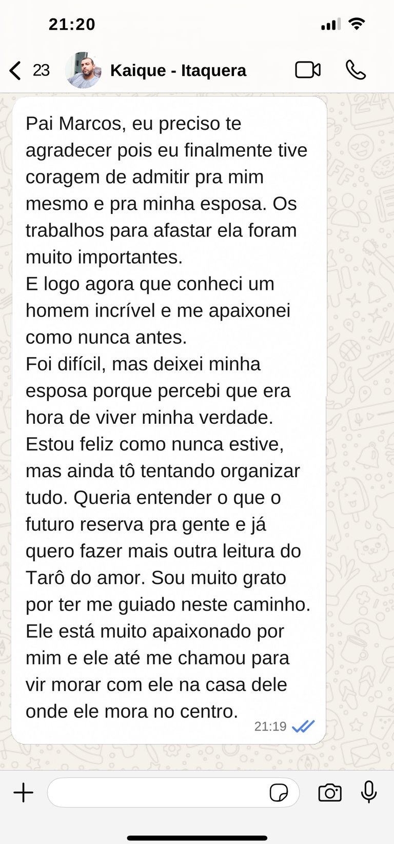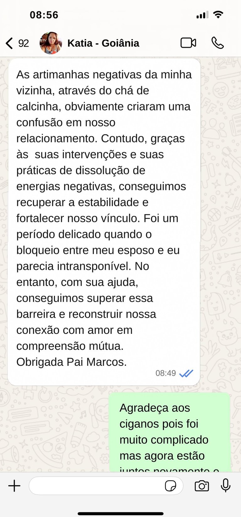 A leitura das cartas feitas por Pai Marcos foi um momento revelador e esclarecedor. Sua orientação trouxe clareza aos meus dilemas, proporcionando-me uma compreensão mais profunda sobre as situações pelas quais eu estava passando. Sou eternamente grato por toda a ajuda, proteção e orientação fornecidas por essas criaturas incríveis. Seu cuidado e intervenção foram essenciais para restaurar a paz e a estabilidade em minha vida pessoal e conjugal. Muito obrigada, do fundo do meu coração.
