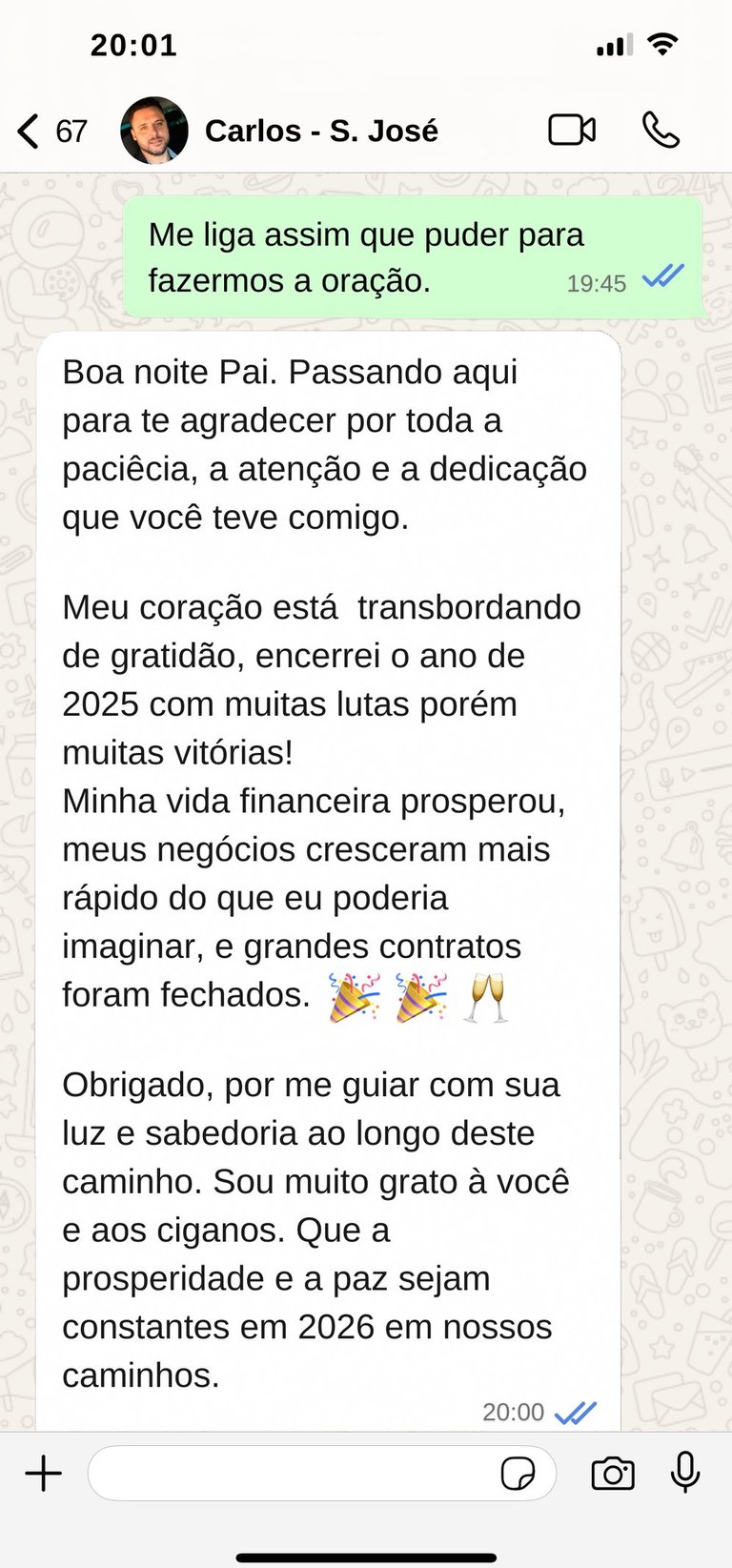 Vocês, Pai Marcos e Cigano Pablo, são verdadeiros guardiões espirituais, dotados de uma compaixão e habilidades singulares. agradecimento do fundo do meu coração por terem dedicado tempo e energia para ajudar a iluminar o meu caminho e trazer cura para minha alma.